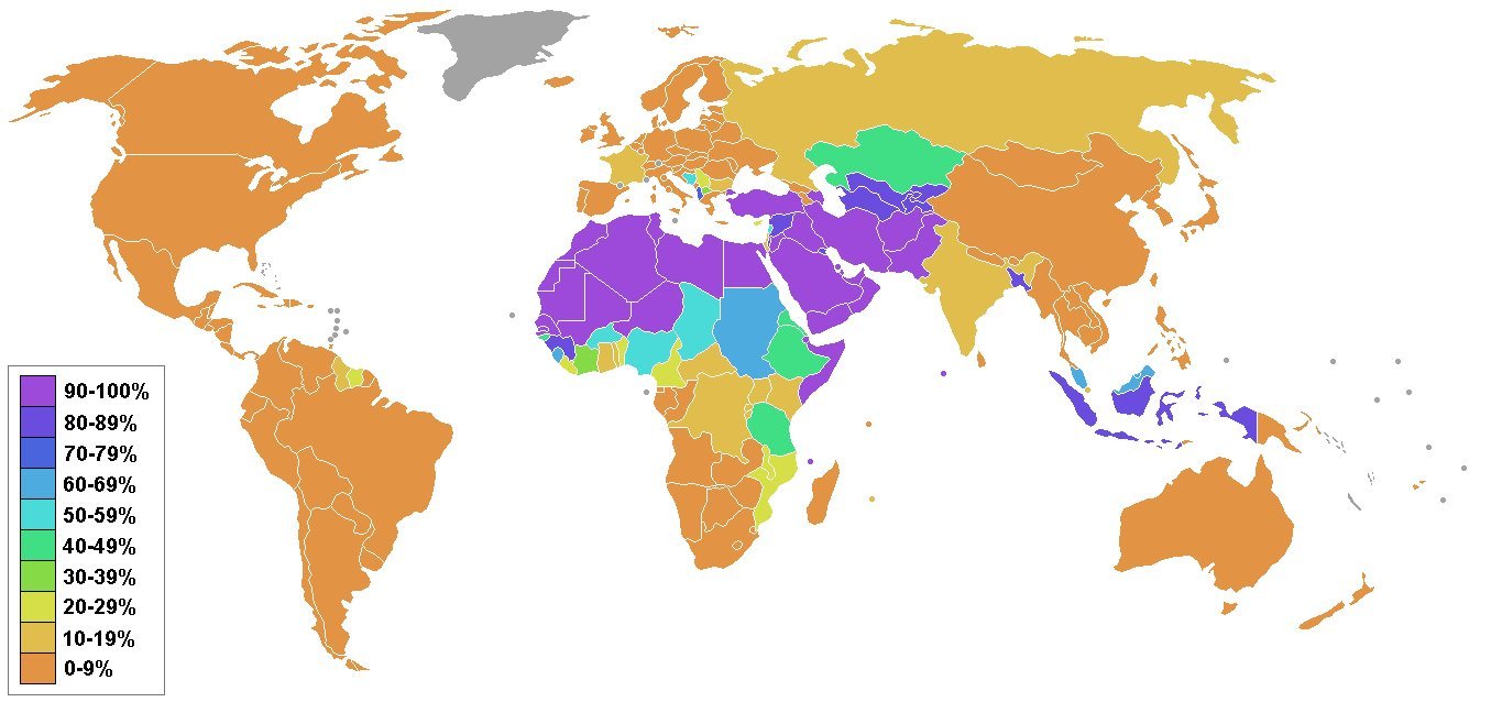 The countries of Turkey, Syria, Iraq, Israel, Egypt, Saudi Arabia, Iran, Oman, Yemen, Afghanistan, Pakistan, Azerbaijan, Kazakhstan, Kyrgyzstan, Tajikistan, Turkmenistan, Uzbekistan, Bangladesh, Malaysia, and Indonesia. and also in North Africa: Morocco, Tunisia, Libya, Egypt, Sudan, as far west as Algeria. And the East coast of Africa, almost to the horn of Africa. At its height it included most of southeastern Europe to the gates of Vienna, including modern Hungary, Serbia, Bosnia, Romania, Greece, and the Ukraine. They had invaded the countries between the Black Sea and the Mediterranean including Spain, where a caliphate was set up. Spain was recaptured by Christian kingdoms in the 13th and 14th century and is only 0-9% Muslim now according to the map below.